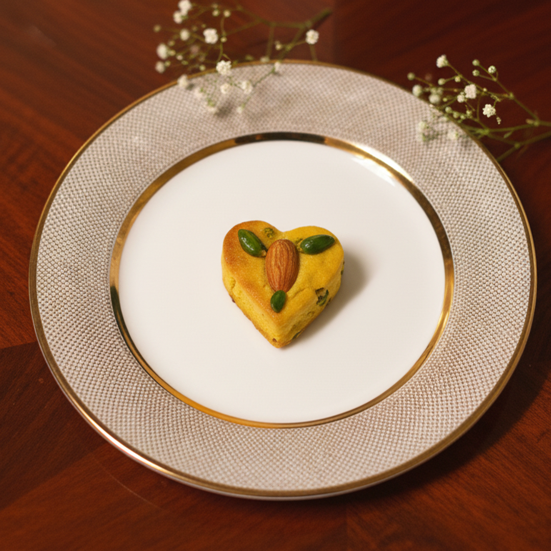 Baked Badam Dilkhush – A royal delight baked to perfection with a rich almond base, blended with cashews, pistachios, saffron, cardamom, and a touch of mishri. Soft yet nutty, fragrant yet indulgent – this heart-shaped treat is a true ode to tradition with a modern twist.