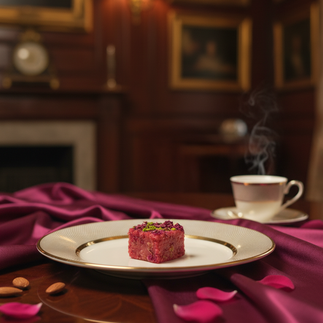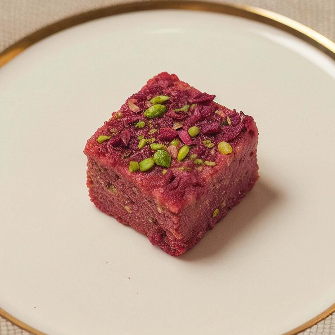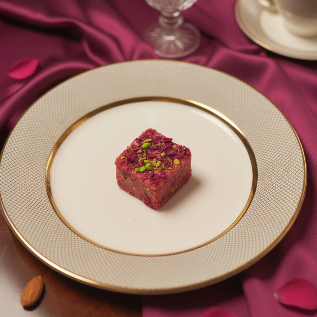 A delicate mithai crafted with rich badam and infused with the fragrance of rose sharbat, topped with real rose petals. This gulab lauj is a floral indulgence that beautifully blends luxury with tradition.